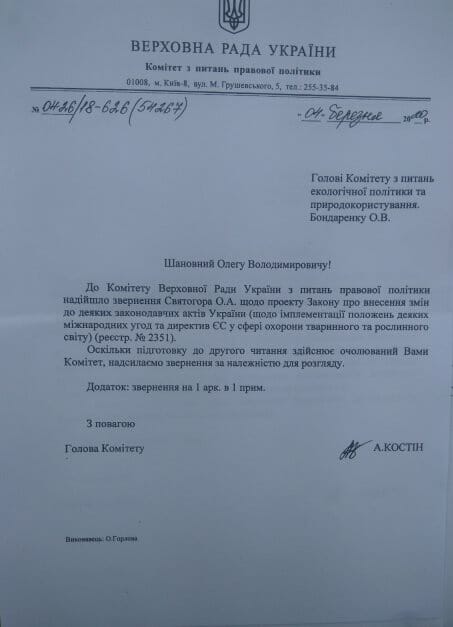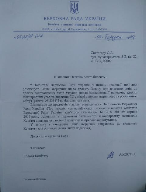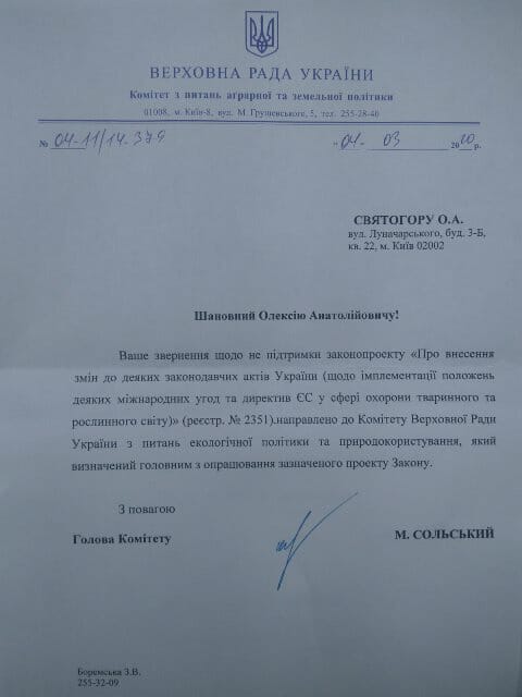 Від багатьох громадян і юридичних осіб до Верховної Ради України активно надходять звернення , у яких містяться численні зауваження щодо нового законопроекту 2351 «Про внесення змін до деяких законодавчих актів України (щодо імплементації положень деяких міжнародних угод та директив ЄС у сфері охорони тваринного та рослинного світу». Свою незгоду з положеннями законопроекту, що спрямований на повну заборону евтаназії безпритульних тварин як методу регулювання їх чисельності, висловлюють мешканці Миколаєва, Харкова, Херсона, Кривого Рогу, Києва та низки інших міст і селищ – люди бояться за себе та своїх рідних, адже закон їх жодним чином не захищає, а за напади бродячих собак ніхто не нестиме відповідальності.